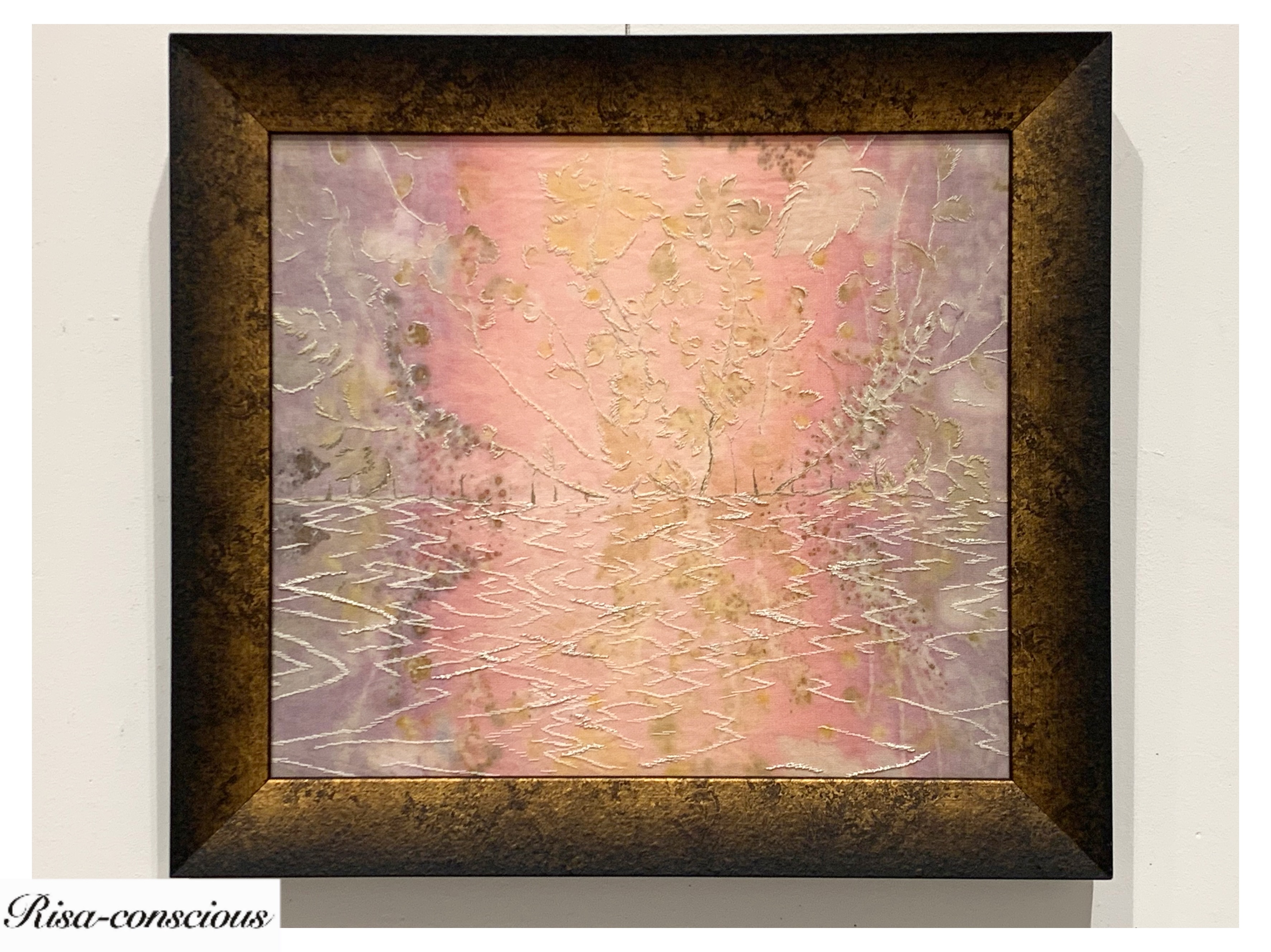 今年の春から習い始めたミディアムプリント(技法:デカルコマニー)で染めた上から見えてくる形を刺繍で表現をし、額装しました。