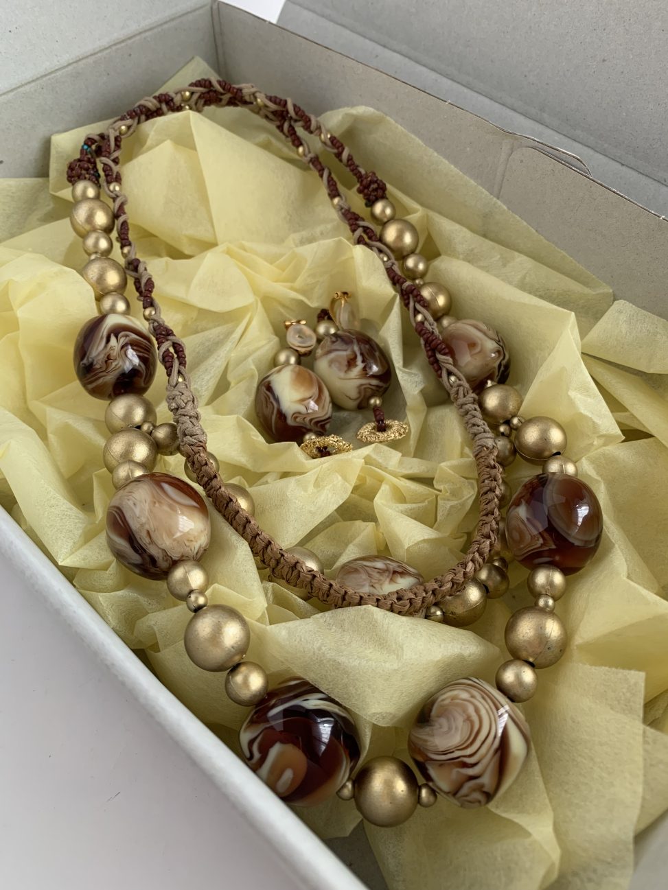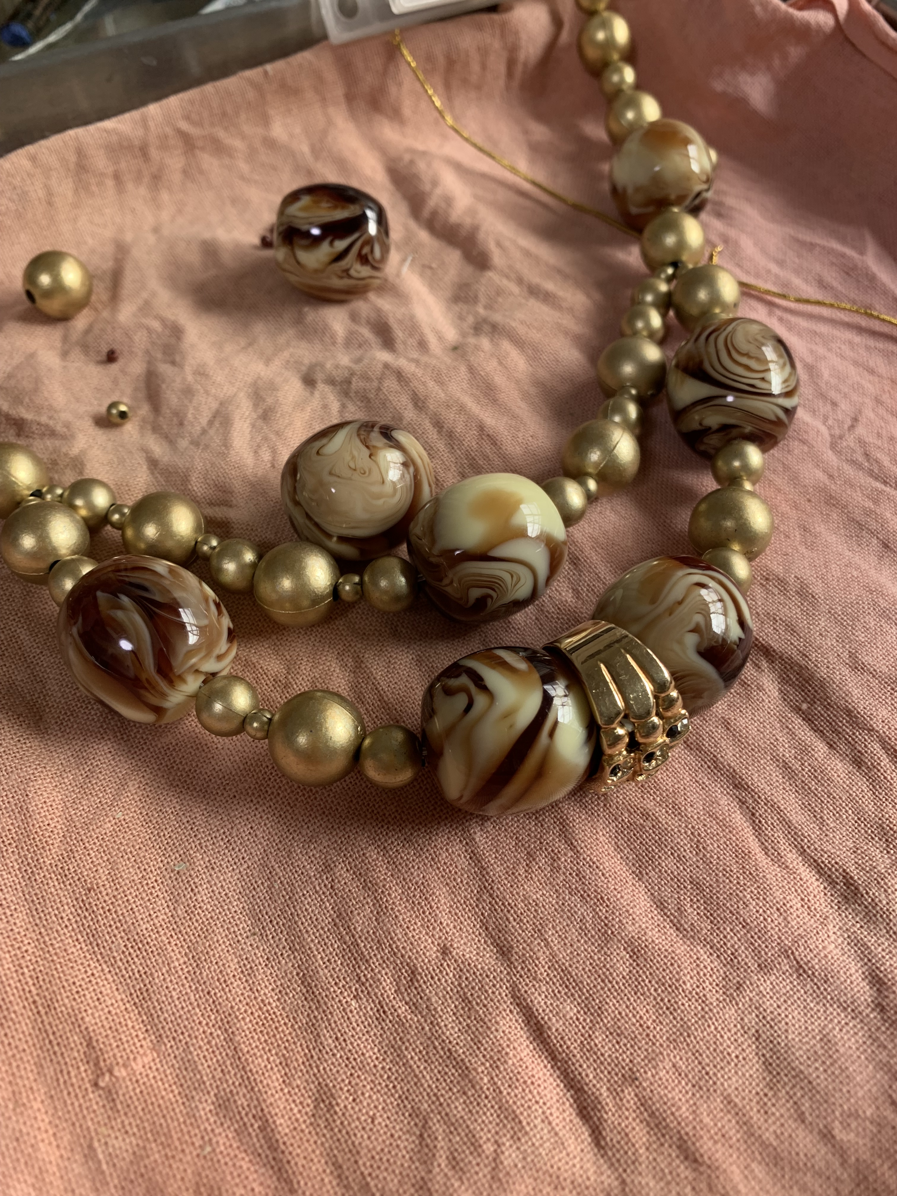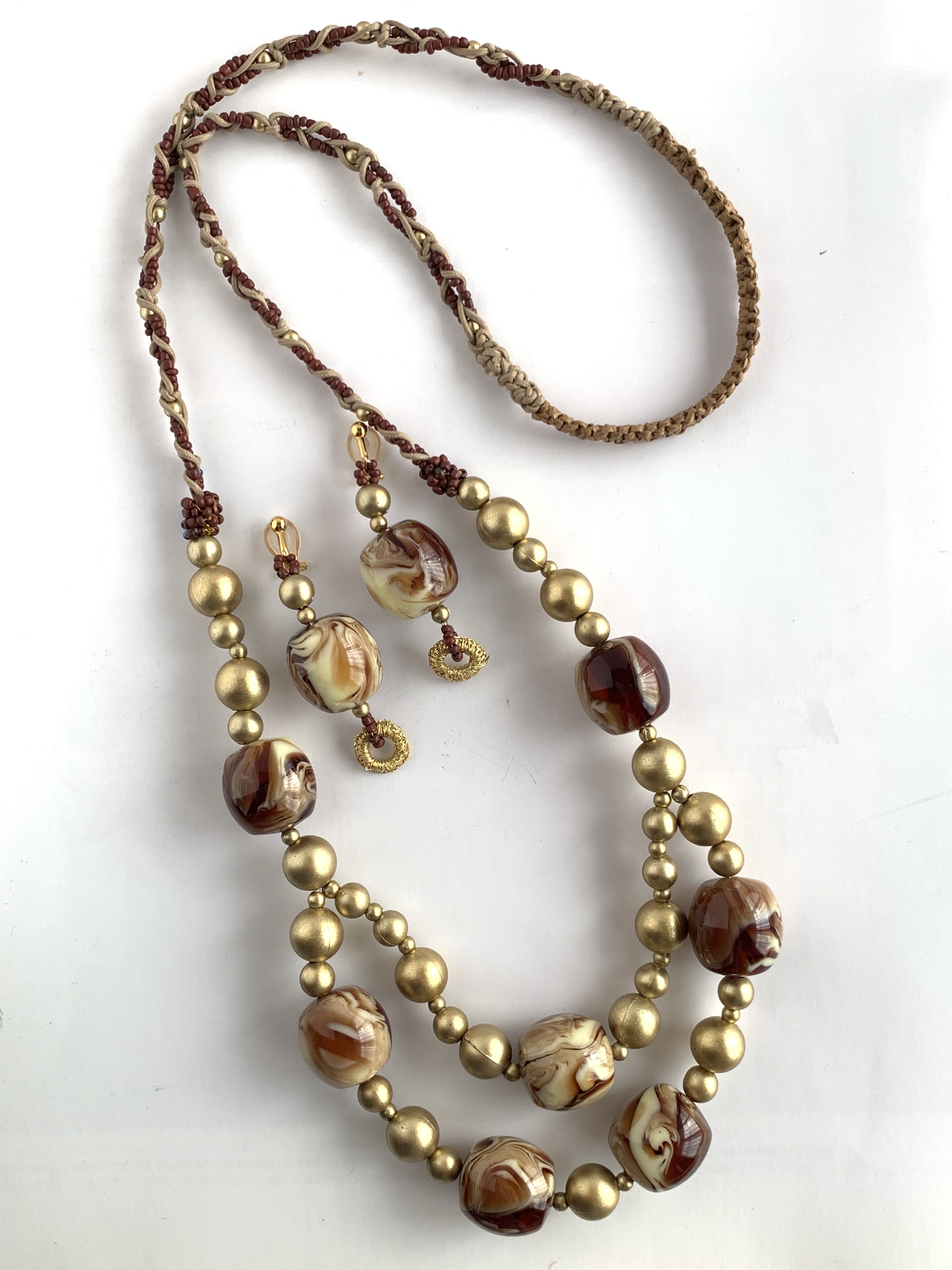 イヤリングはビーズとメノウに加え、元々エスニックネックレスで使用していたマルカンにゴールドの糸を巻き、仕上げています。