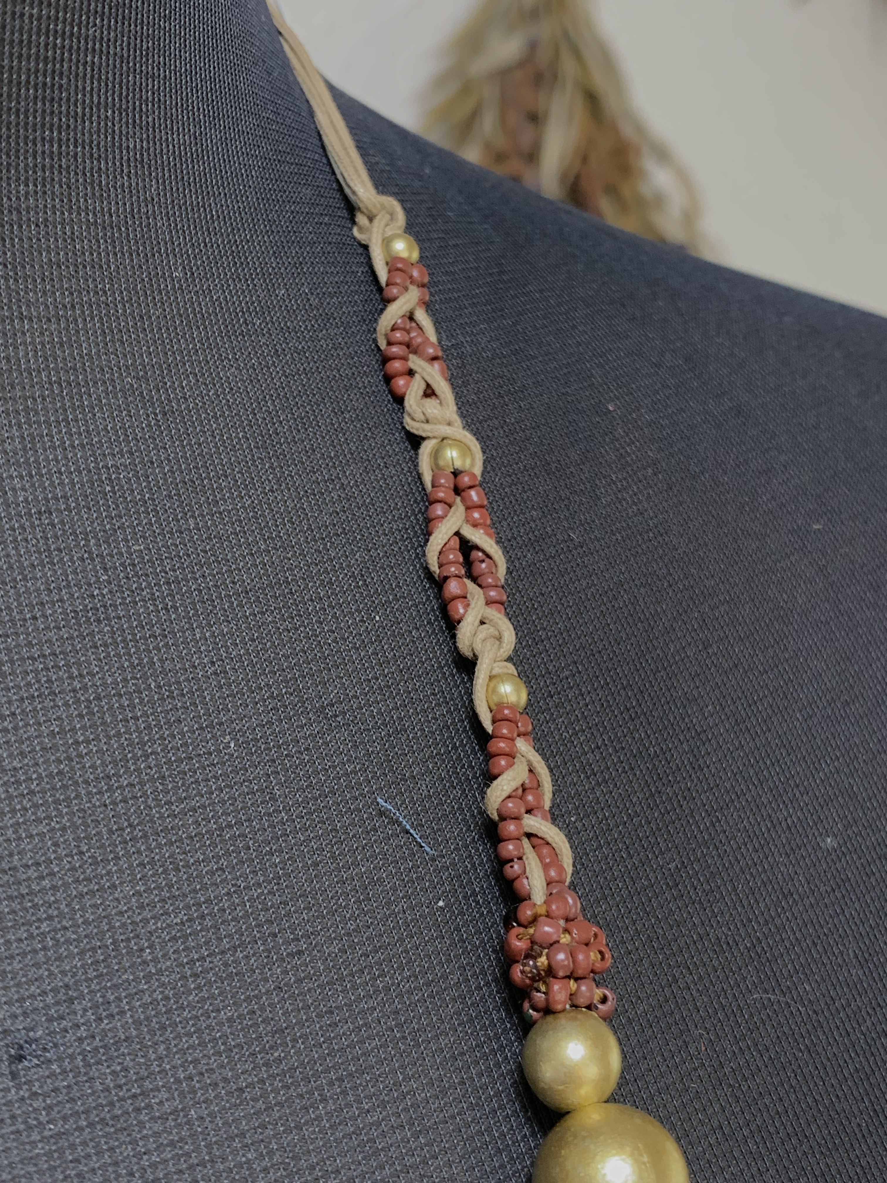 トップの華やかさが映え、違和感のない作りを目指して綿コードとビーズを編むようなデザインを考え形にしました。